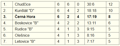 23.6. Černá Hora - Rudice "B" 3:3 (6:6, 39:51)