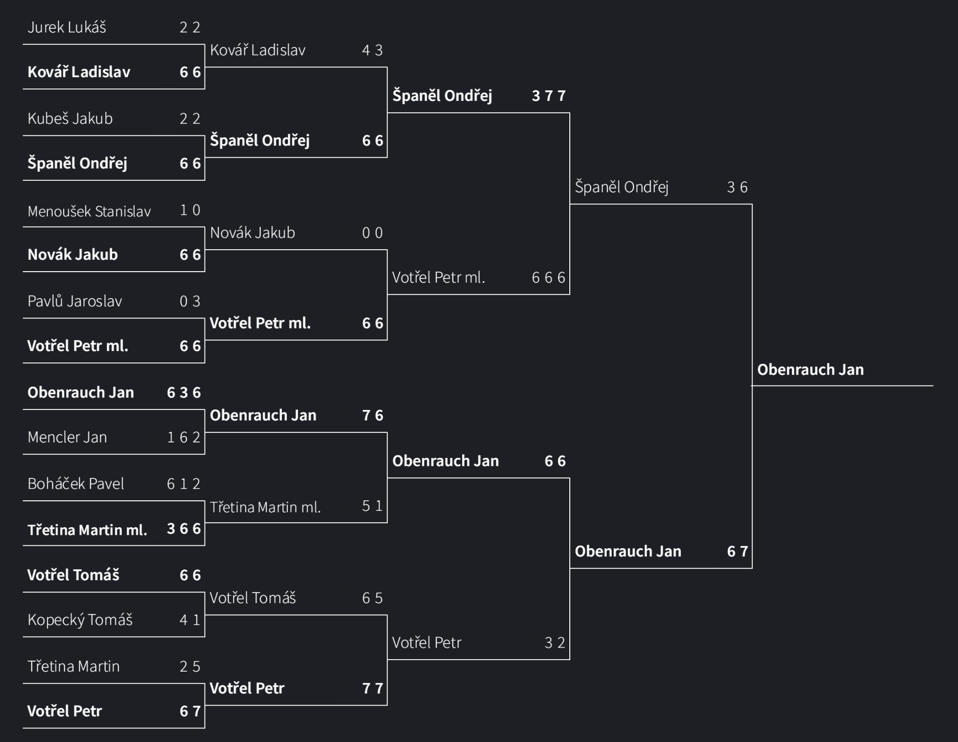 18:00 Obenrauch J. (Lysice) - Mencler J. (Jestřebí) 6:1 3:6 6:2